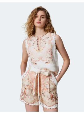 Top de lino con estampado posicionado de flores de estilo tapestry, rematado en la sisa y en el escote con pasamanería en semicírculo. Presenta un cuello redondo con abertura en V en la parte delantera, placa con logotipo Oval T en la parte trasera y corte recto.